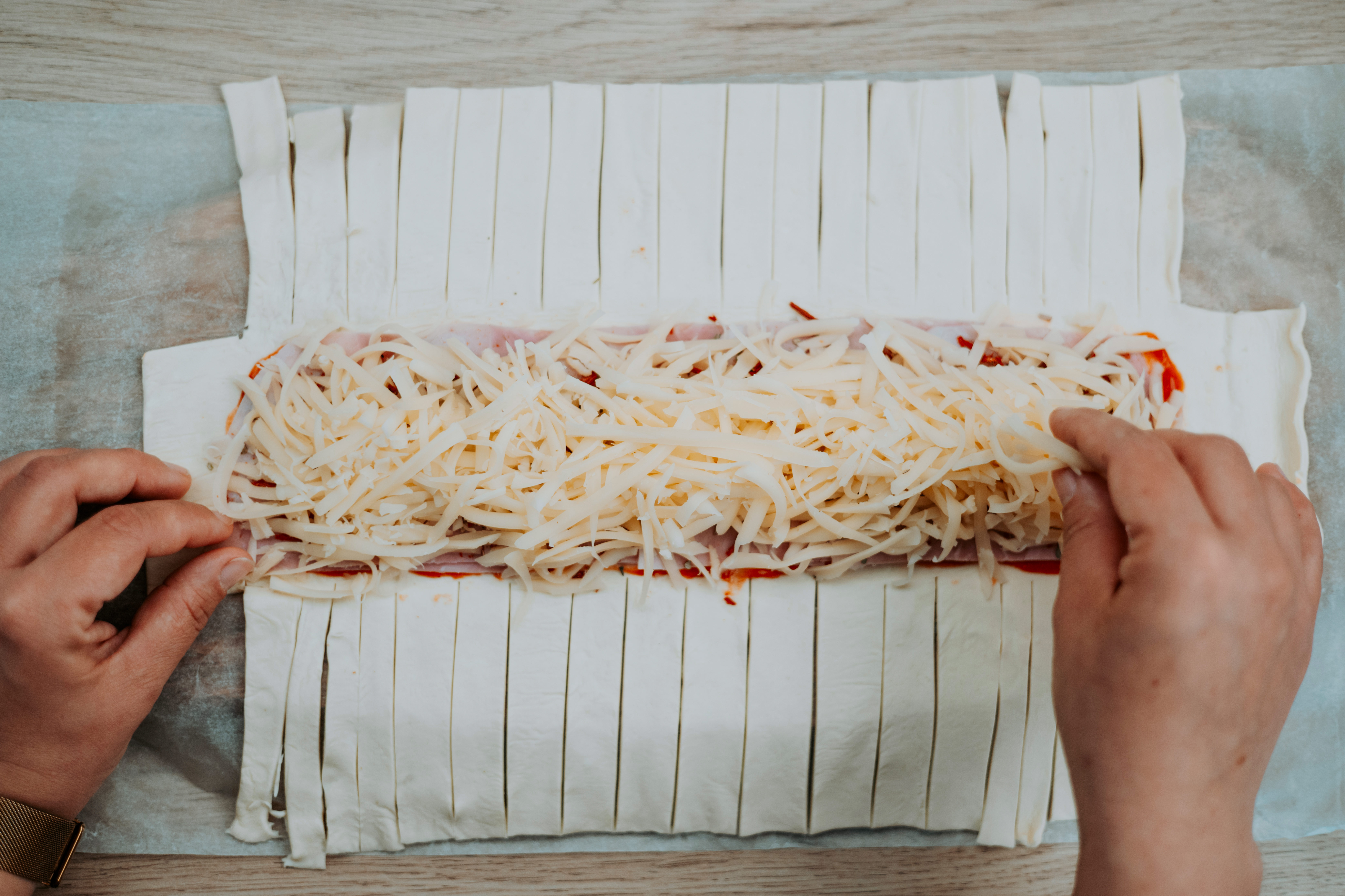 1Listové těsto rozložte na obdélník. Pomyslně jej podélně rozdělte na 3 stejné díly a nařežte ho dle fotky.